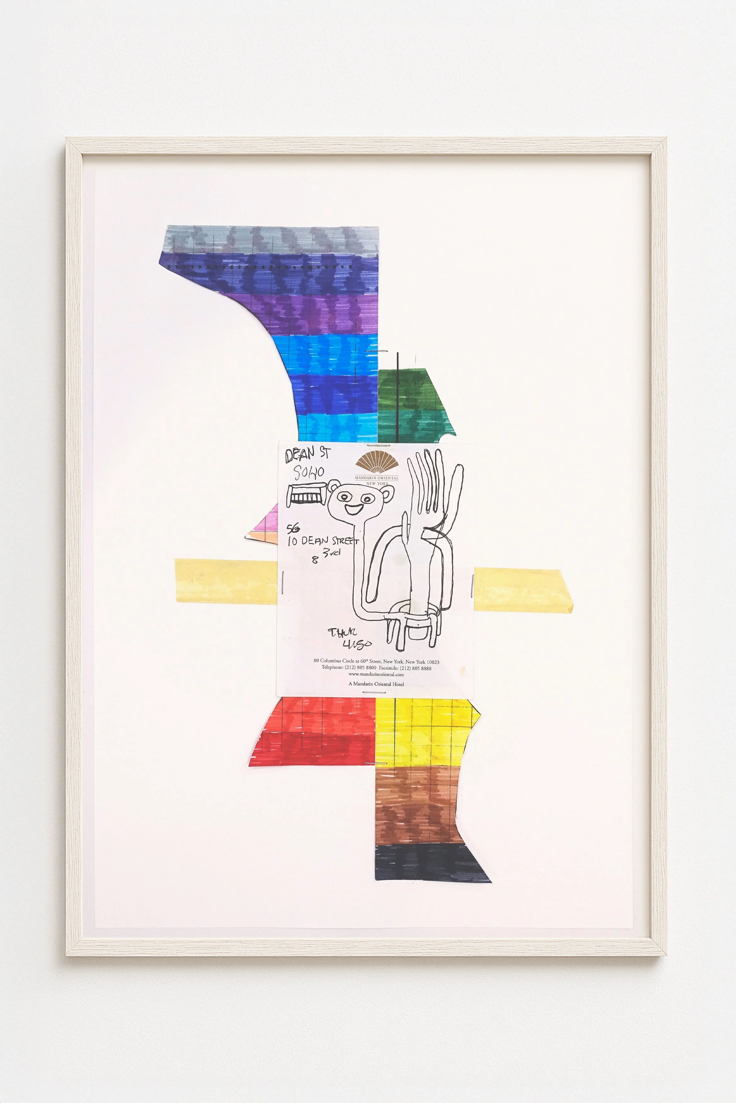 Part of Heartware Protocol: Systems of a Loop, this collage combines a restaurant receipt, a quick line drawing, and fragments of color-blocked paper. The notepad functions like a log of passing time—an incidental archive. Marker bands recall scanner interference, while the drawing operates as a soft code of gesture and recollection.