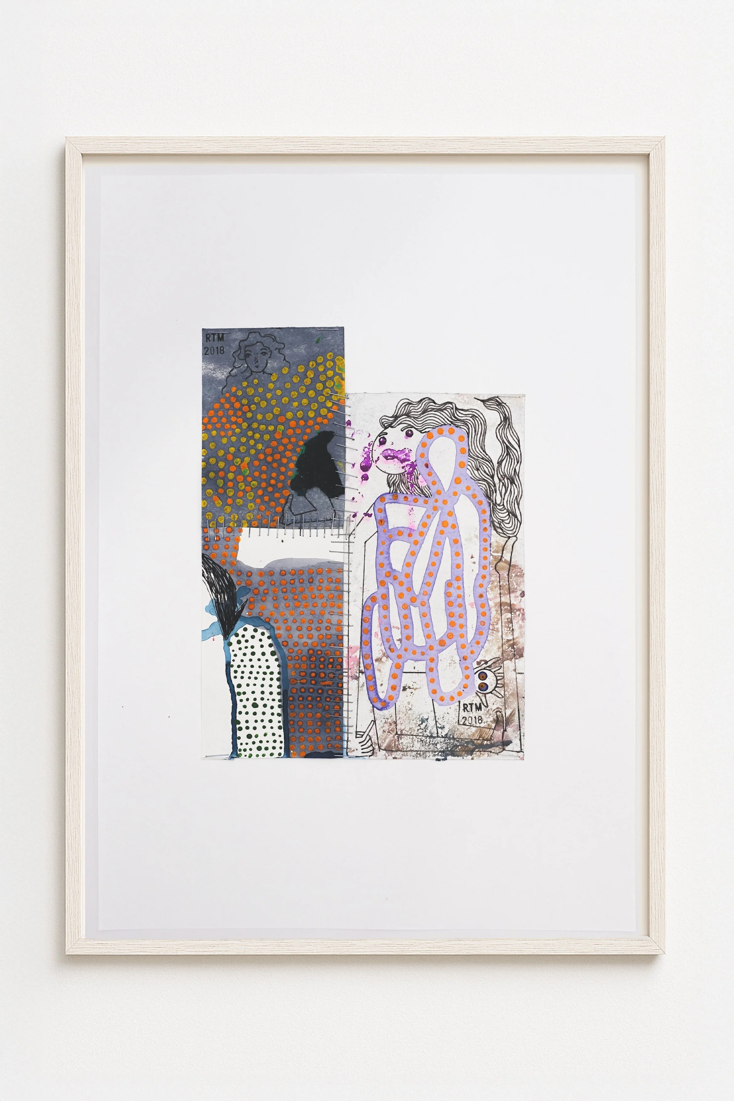 Composed from layered paper fragments and drawings, this collage merges dotted patterning with hand-drawn figuration. The polka fields mimic data arrays—loops of visual rhythm translating touch into repetition. Each mark acts as an emotional signal, suspended between ornament and syntax.
