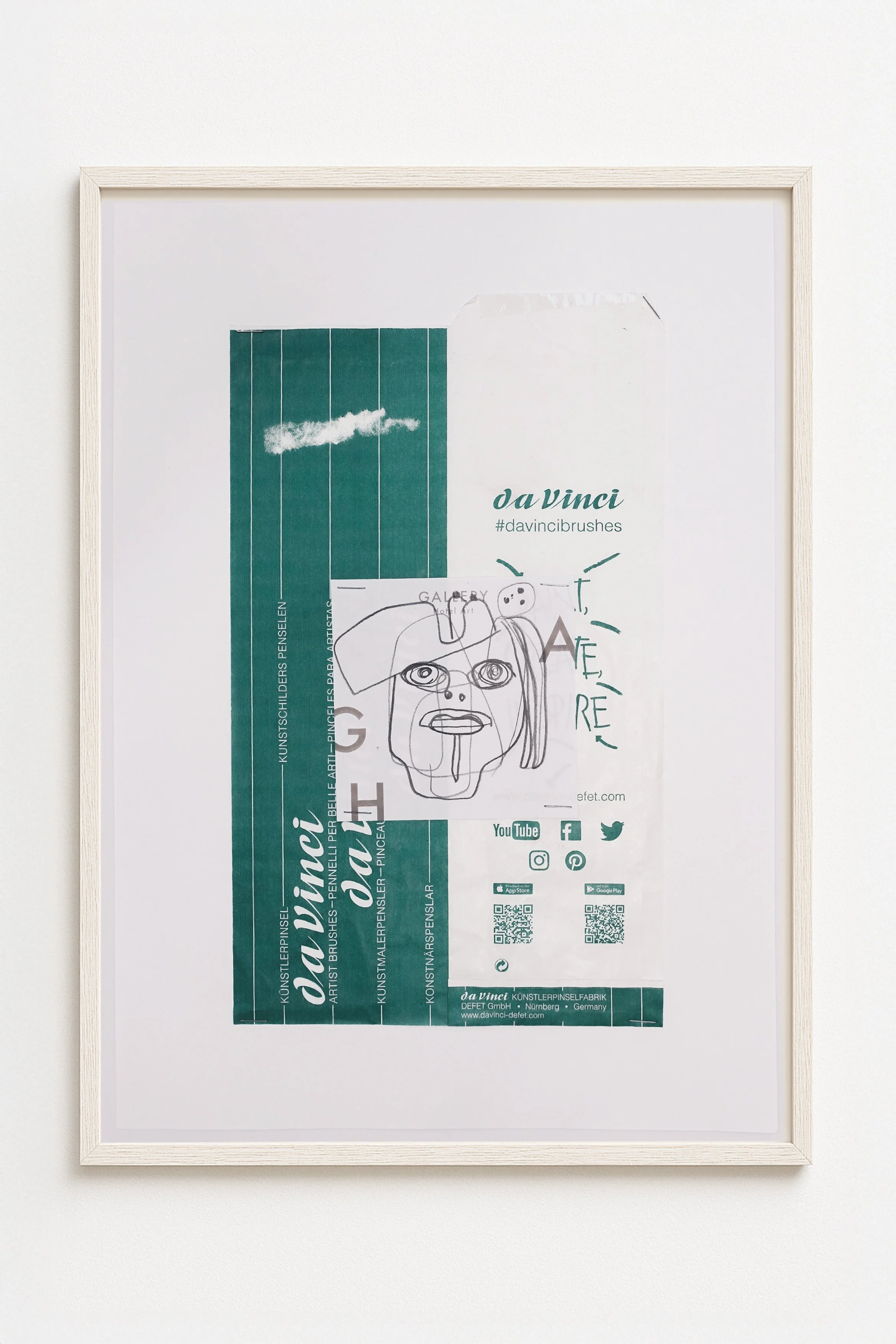 Fragments of envelopes, receipts, packaging, and drawings form the foundation of these post-digital composites. Each work emerges through a process of recombination—paper, print, and residue negotiating their own hierarchies.