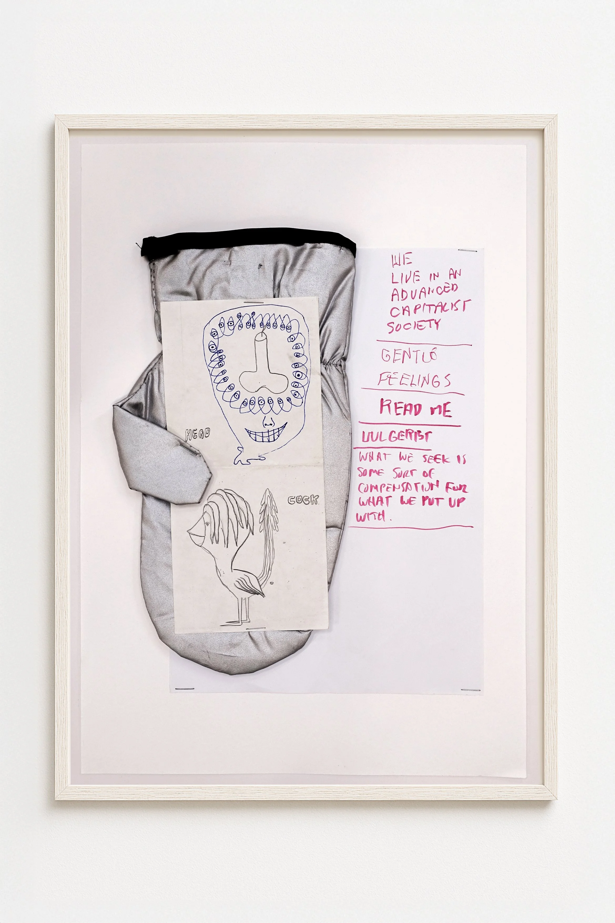 005 – Heartware Protocol: Vulgar Loop. this collage brings together a fireproof cooking glove, hand-drawn sketches, and handwritten notes. The silver glove operates as both shield and relic—an object of domestic labor and emotional defense. Phrases like “We live in an advanced capitalist society” and “Gentle feelings / Read me / Vulgarist” expose the absurdity of self-expression under pressure. Humor and critique fold into one another, transforming heat and protection into emotional code.