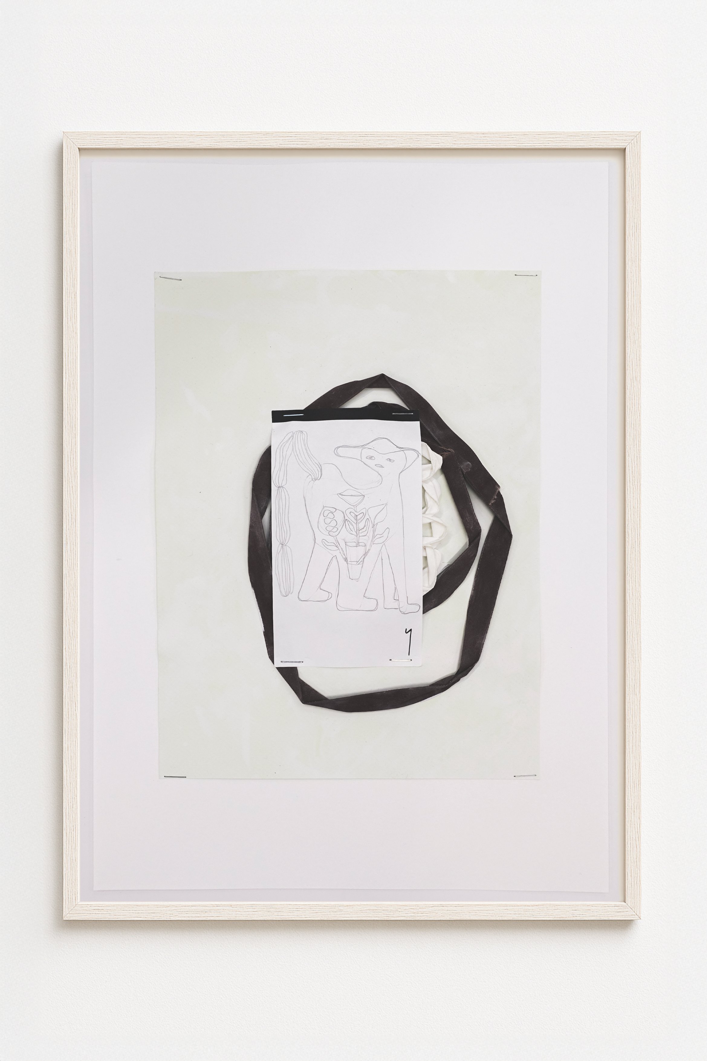 This collage layers a graphite line drawing over a looped strip of black fabric and a coiled base of pressed material. The elements form a closed system—an index of containment and gesture. The loop behaves as both boundary and signal, encircling the figure like a protective error. The work suggests a quiet feedback between drawing and object, where containment becomes an act of care.